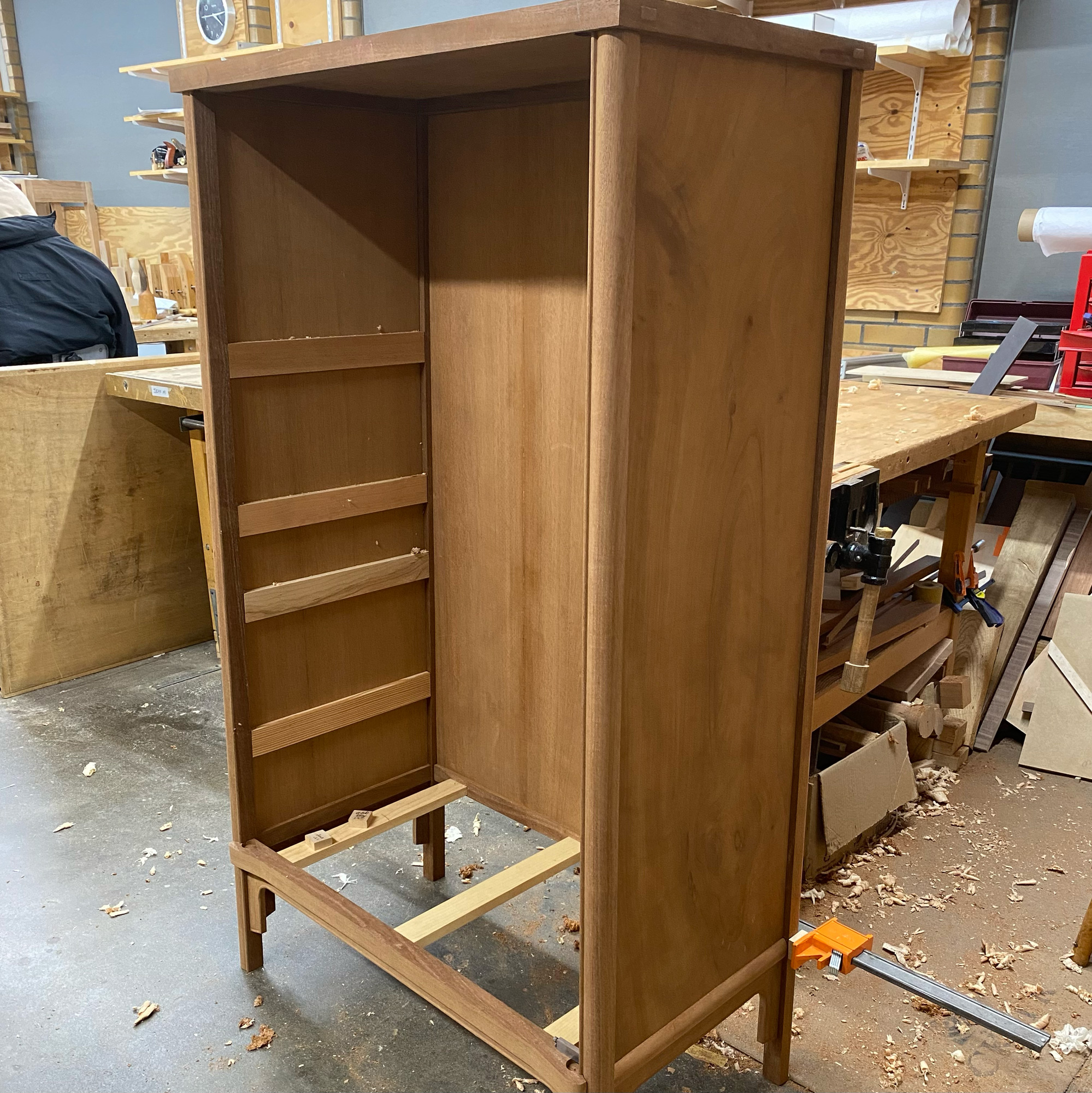 The case was leveled, and the central mullion was cut and fit.